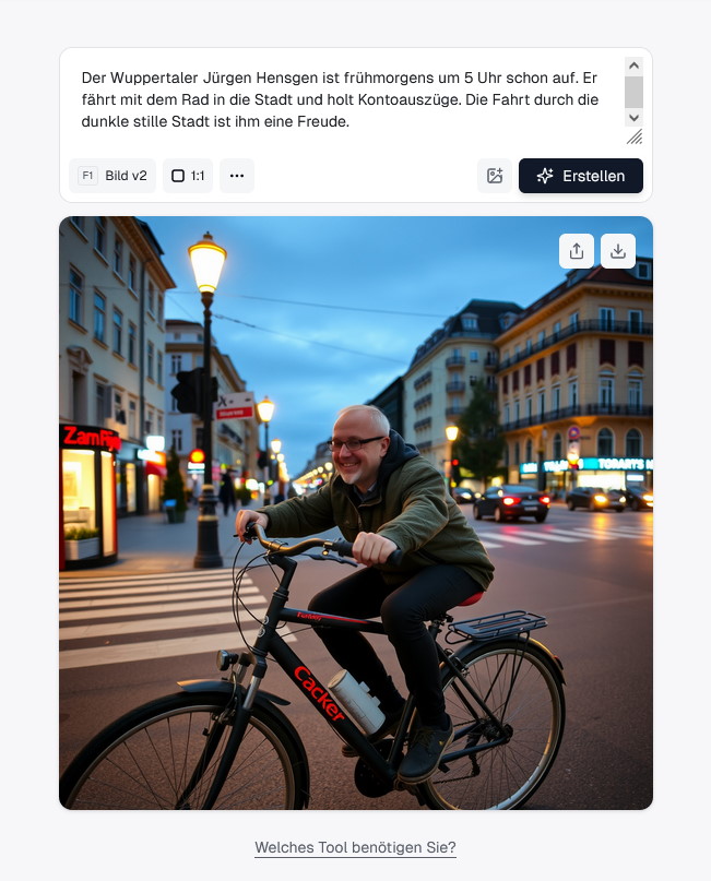 Den hat Kumpel Jan gemacht auf meine Anweisung. Jan sprach ins Smartfone, er wolle einen Obdachlosen auf einem Sessel. Bevor er dazu kam zu sagen, dass der in einem Zimmer sitzen soll, fiel ihm die KI ins Wort und zeigte das Bild. Darum steht sein Sessel auf der Straße. Die KI geht wohl davon aus, dass Obdachlose auf der Straße sitzen. Aber dass sie da in der Regel keine dicken Sessel haben, weil da Autos fahren, darauf ist sie nicht gekommen. Indem die KI einem ins Wort fällt, zeigt sie menschliche Züge, das kannte ich bisher nur von Leuten wie meinem Kumpel Jan.