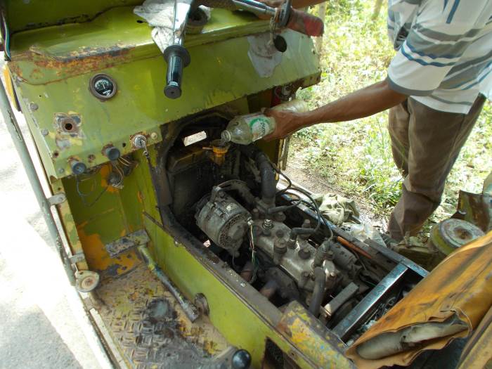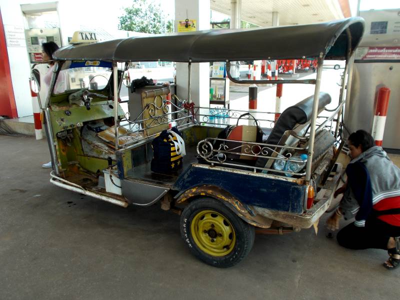 Das ist unser Fahrer, Mister Tanom, 55, und ich dachte, sein Vehikel sei genauso alt wie er, dem Rostfraß nach konnte es hinkommen, aber das Teil war erste 30 Jahre alt. Er fahre Tuk Tuk schon immer, sagte er.
