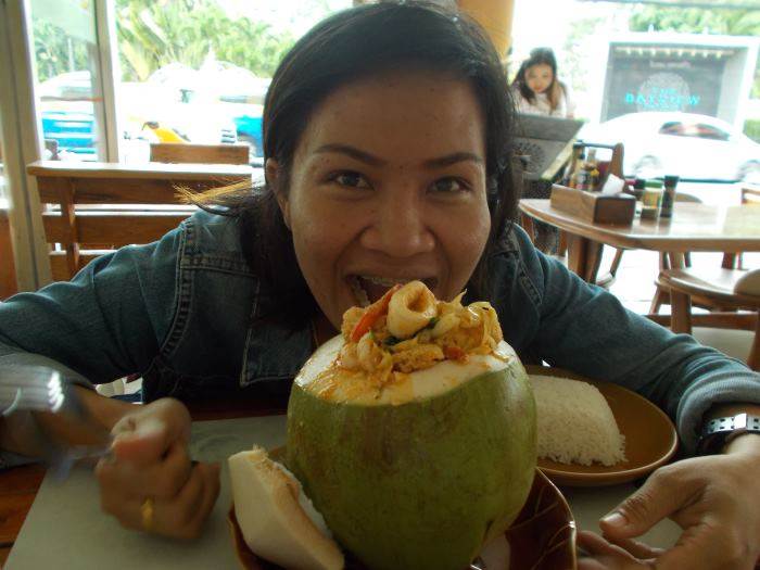 Abschiedsessen mit Sam, sie isst heißes Seafood aus einer gekühlten Kokosnuss.