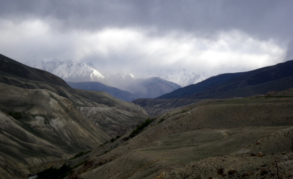 Leider etwas diesig: Der linke Eisbedeckte ist der Peak Karl Marx, rechts daneben, nicht ganz so hoch, der Peak Friedrich Engels in Tadjikistan