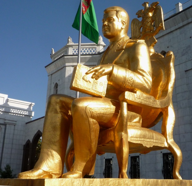 Saparmyrat Nyyazow, Ex-Präsident von Turkmenistan in der Hauptstadt Ashgabat. In der Hand das Ruhnama (Buch der Seele), die Pflichtlektüre für das Volk. Die Titanic-Redaktion war traurig, als er gestorben war, es gebe nun weniger zu lachen.