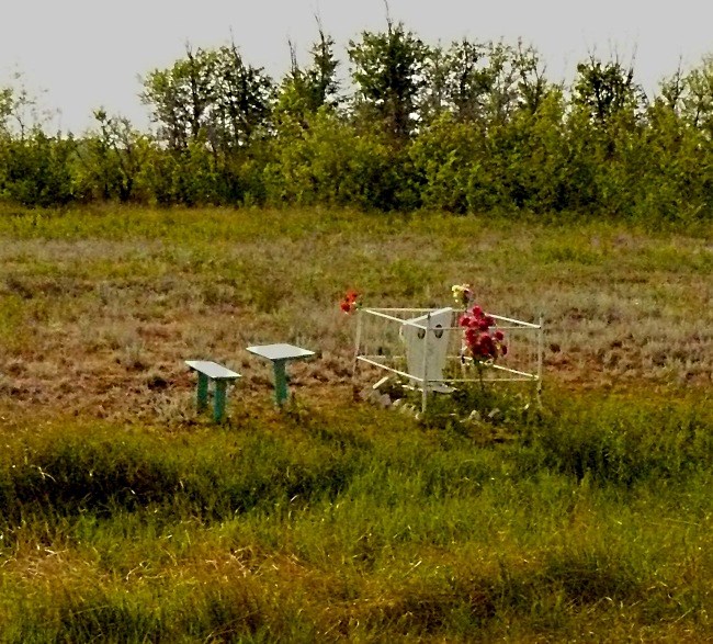 Gedenkstätte in Kasachstan mit Tisch und Bank für den Geist des Verstorbenen. Thailänder hätten was zu essen und zu trinken hingestellt.