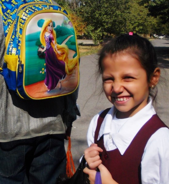 Schulmädchen mit Rucksack im Bobur Park Tashkent / Usbekistan.